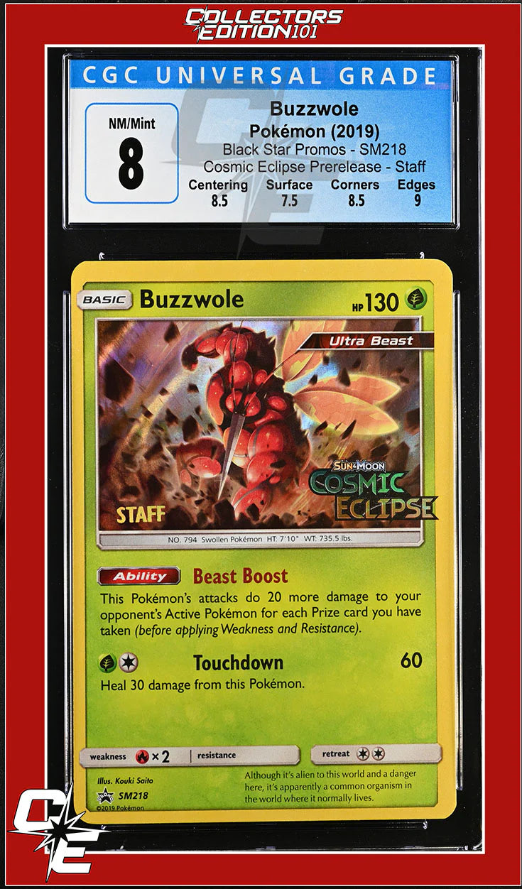 SM Black Star Promo Buzzwole SM218 Cosmic Eclipse Prerelease STAFF CGC 8