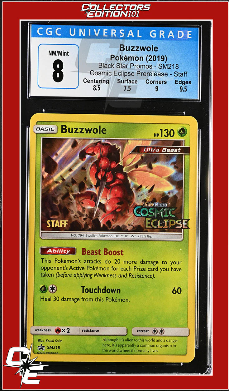 SM Black Star Promo Buzzwole SM218 Cosmic Eclipse Prerelease STAFF CGC 8